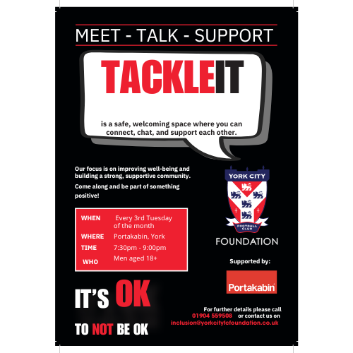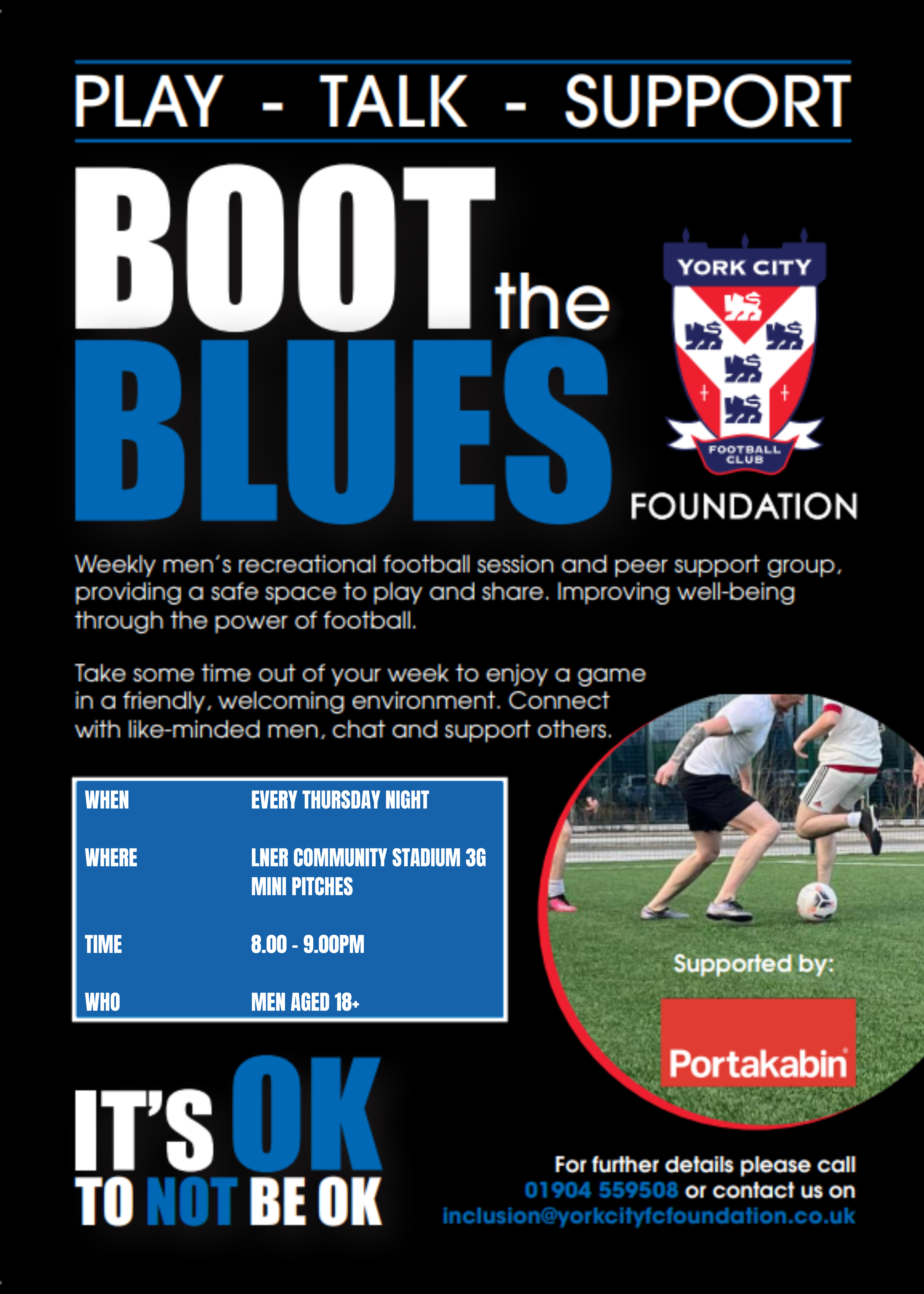 Boot The Blues, is a weekly football session run by York City FC Foundation coaches designed to suit the needs of the participants and providing a social environment to encourage peer support. The fun nature of these offers the participants the opportunity to switch off and let the activity take over, and the social side allows the sense of involvement in a group, social interaction with likeminded individuals and a chance to be themselves.